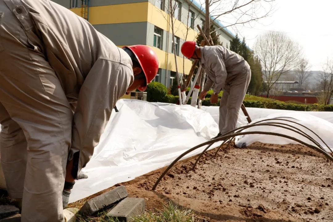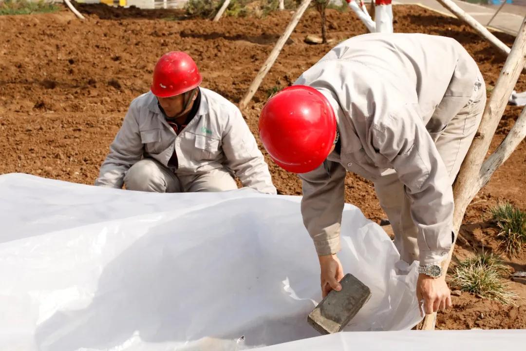 綠化帶內(nèi)工人師傅們默契配合,撒種、扶苗、培土,一氣呵成,并利用塑料薄膜支起了一座座“小拱棚”,盡管泥土沾身,但從他們臉上看到的是對未來的美好憧憬。