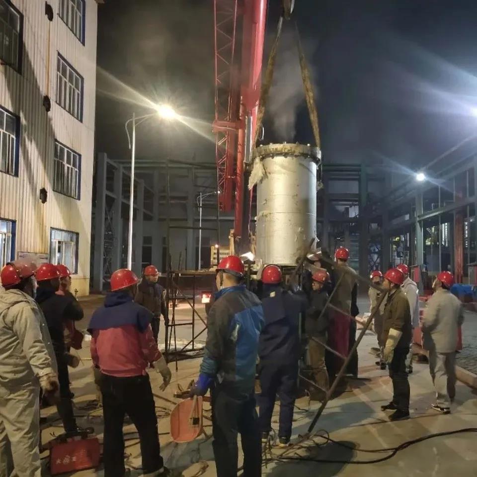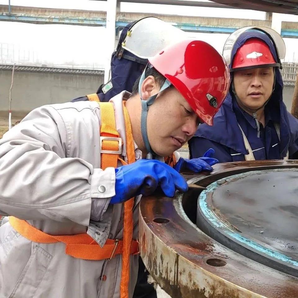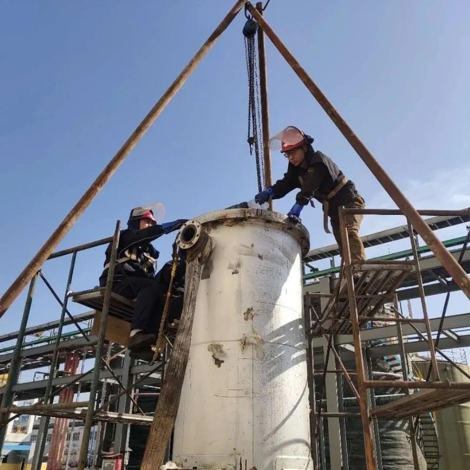 .jpg)        二、攻堅(jiān)克難 勇于創(chuàng)新我廠所用的關(guān)鍵設(shè)備多為進(jìn)口設(shè)備,使用最多的就是上海賢達(dá)梅爾森過(guò)程設(shè)備有限公司生產(chǎn)的進(jìn)口石墨換熱器,其價(jià)格也是最為昂貴的一種。2020年2月28日大夜班操作工在巡檢中發(fā)現(xiàn)蒸餾A塔石墨換器底座有滲漏現(xiàn)象,并及時(shí)報(bào)告班長(zhǎng)、調(diào)度及值班干部。這臺(tái)設(shè)備出廠價(jià)高達(dá)110萬(wàn)元,即使返廠維修也需要12萬(wàn)元之多,維修周期也需要10-15天,不僅維修費(fèi)用高,且正值疫情期間,維修時(shí)間難以保障,經(jīng)廠部會(huì)議討論決定,自主對(duì)石墨換熱器進(jìn)行檢查維修。如果自主維修取得成功,不僅可以節(jié)省高昂的維修費(fèi)用,還能極大的縮短維修周期,及時(shí)保障系統(tǒng)正常運(yùn)行,也進(jìn)一步增強(qiáng)檢修人員的檢修經(jīng)驗(yàn)水平。次日9時(shí)整,在岳廠長(zhǎng)的親自指揮下,檢修工作開始有條不紊的進(jìn)行,電、儀、焊、鉗分工明確。因?yàn)槭鞘状螜z修此類設(shè)備,對(duì)內(nèi)部結(jié)構(gòu)不是特別了解,所以檢修工作相當(dāng)于是在摸索中前進(jìn),對(duì)不懂的問(wèn)題及時(shí)請(qǐng)教廠家技術(shù)人員或查找相關(guān)資料。晚上22時(shí),經(jīng)現(xiàn)場(chǎng)打壓試漏,終于完成對(duì)換熱器的拆檢維修,運(yùn)行指標(biāo)穩(wěn)定正常。在整個(gè)過(guò)程中全體干部緊盯安全、票證、質(zhì)量、進(jìn)度四個(gè)工作要求,敢于創(chuàng)新,攻堅(jiān)克難。這次檢修工作,開創(chuàng)了我廠自主維修進(jìn)口設(shè)備的先河,干部員工積累了豐富的工作經(jīng)驗(yàn),到目前為止通過(guò)類似的檢修工作,直接節(jié)省維修費(fèi)用超30萬(wàn)元。
