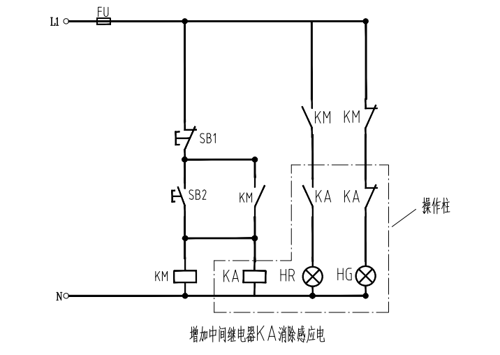 5、在操作柱內(nèi)安裝一個(gè)中間繼電器對(duì)感應(yīng)電進(jìn)行有效隔離,通過(guò)繼電器的常開常閉觸點(diǎn)控制設(shè)備的啟停指示燈(如圖所示),感應(yīng)發(fā)亮現(xiàn)象可有效避免。
