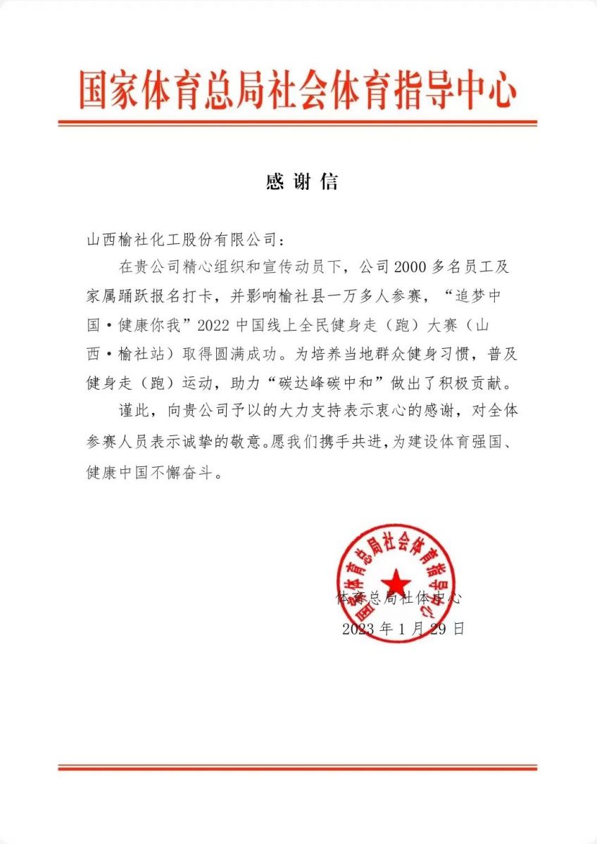 這封帶著溫度的感謝信,是對健康榆化建設的肯定,也是對榆化人健康生活的點贊。近年來,公司積極響應國家全民健身號召,修繕職工籃球場、羽毛球場地,新建職工健身館等,為員工提供良好的運動健身條件;舉辦籃球賽、拔河賽等賽事,組織榆化拔河隊參加省、市、縣拔河爭霸賽,并取得優(yōu)異成績;開展全員體能測試、越野達標、健身達標等活動,促進員工關(guān)注體重指數(shù)、血壓、心率等身體指標,引導員工培養(yǎng)健康的生活方式,為企業(yè)文化注入健康、文明、自律的新內(nèi)涵。健康榆化為榆化人的幸福“加碼”。