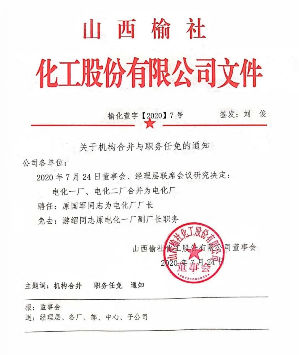 7月24日,公司召開董事會、經(jīng)理層聯(lián)席會議,副廠部級以上領導參加會議。會議通報了電化一廠副廠長游紹在電化一廠調(diào)度選聘工作中,違背公開、公平、公正的原則,未能按公司制度嚴格進行民主測評,破壞了公司風清氣正的選人用人環(huán)境,影響極其惡劣,決定免去游紹同志原電化一廠副廠長職務。為優(yōu)化管理結構,提高管理效率,會議研究決定將電化一廠與電化二廠合并為電化廠,聘任原國軍同志為電化廠廠長。