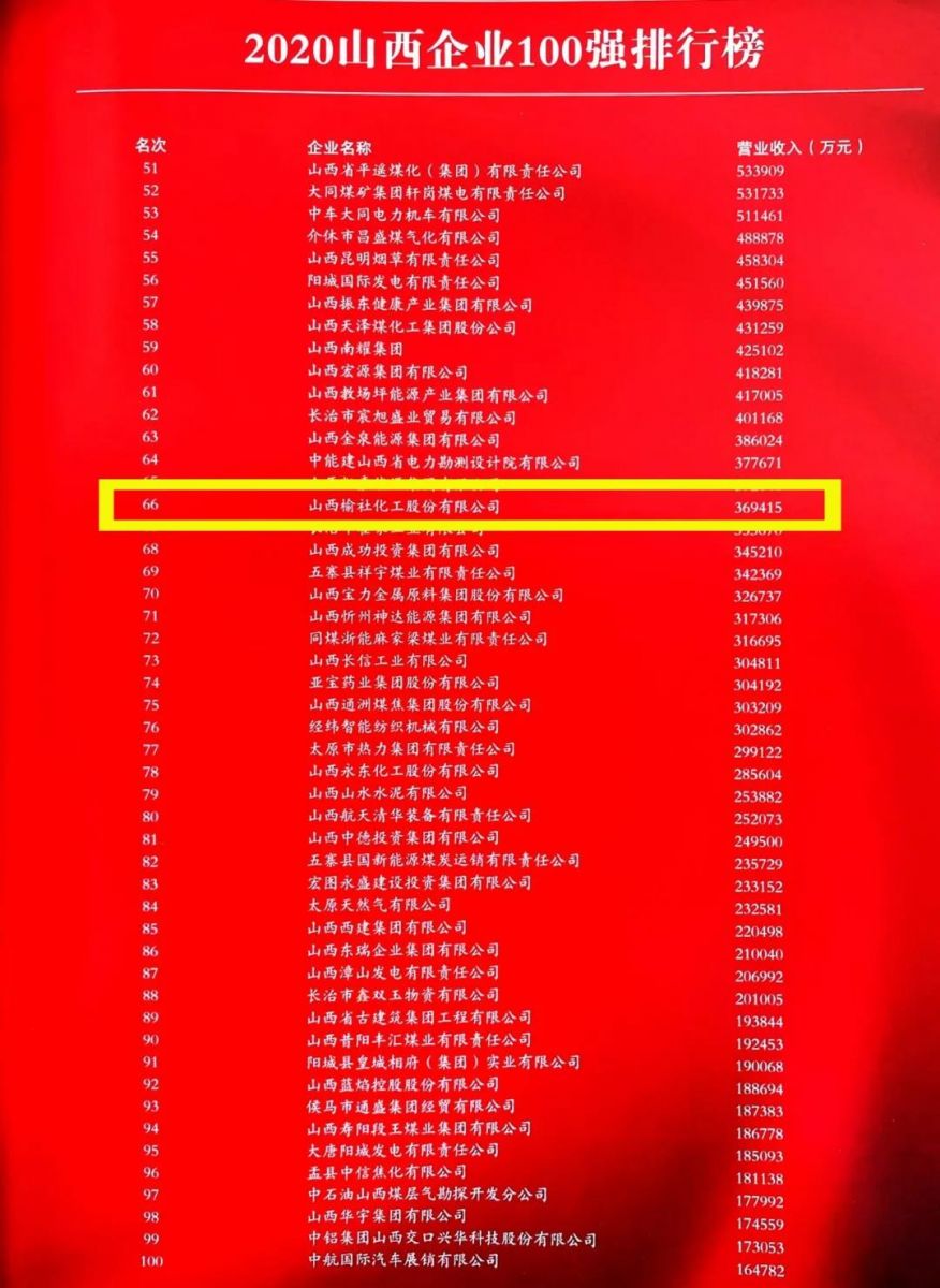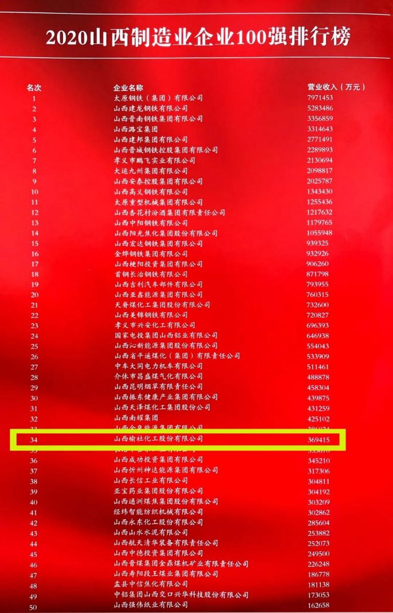 山西企聯(lián)攜手山西財經(jīng)大學,連續(xù)第17年向社會發(fā)布“山西企業(yè)100強排行榜”。同時發(fā)布《山西企業(yè)100強(年度)發(fā)展報告》。山西企業(yè)百強榜為綜合100強,制造業(yè)100強和服務(wù)業(yè)100強。2020山西企業(yè)100強營業(yè)收入總額20149.47億元,較上年提高7.7%,其中營業(yè)收入上千億的企業(yè)7家,入圍門檻16.48億元,比上年提高1.05億元,增幅6.8%。平均資產(chǎn)總額較上年增長7.46%。經(jīng)山西省百強企業(yè)排序?qū)<椅瘑T會審定,山西榆社化工股份有限公司榮獲2019年度功勛企業(yè)、2020年山西省100強企業(yè)稱號、2020年山西省制造業(yè)100強企業(yè)稱號。