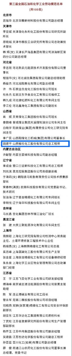 1月15日,第三屆全國石油和化學工業(yè)先進集體、勞動模范和先進工作者表彰大會采用線上線下相結合的方式在京召開。會上,人力資源和社會保障部、中國石油和化學工業(yè)聯(lián)合會表彰了81個單位“全國石油和化學工業(yè)先進集體”、105名“全國石油和化學工業(yè)勞動模范”、10名“全國石油和化學工業(yè)先進工作者”。公司總工程師田建平被授予“全國石油和化學工業(yè)勞動模范”稱號,享受省部級勞模待遇。