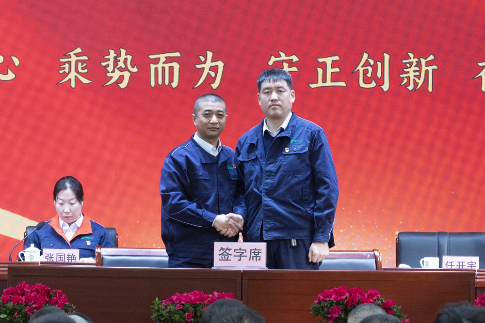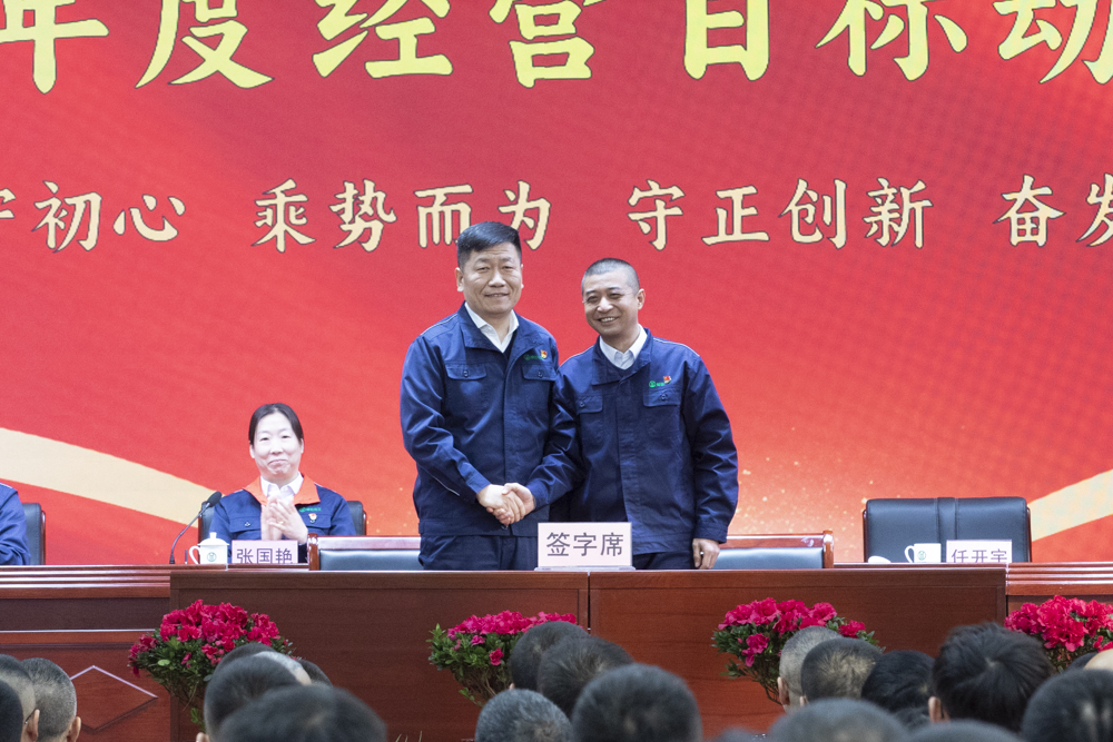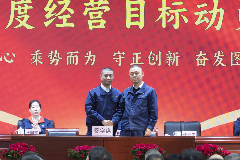 公司黨委書記、董事長楊柳青分別與總經(jīng)理、財務(wù)總監(jiān)、人力資源負責人簽訂目標責任書,黨委副書記、總經(jīng)理任開宇分別與總工程師、山西榆化精細化工有限公司法人代表、榆社縣遠安物流有限公司負責人簽訂目標責任書。
