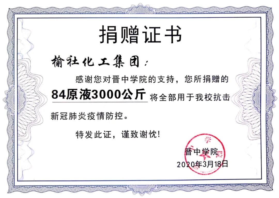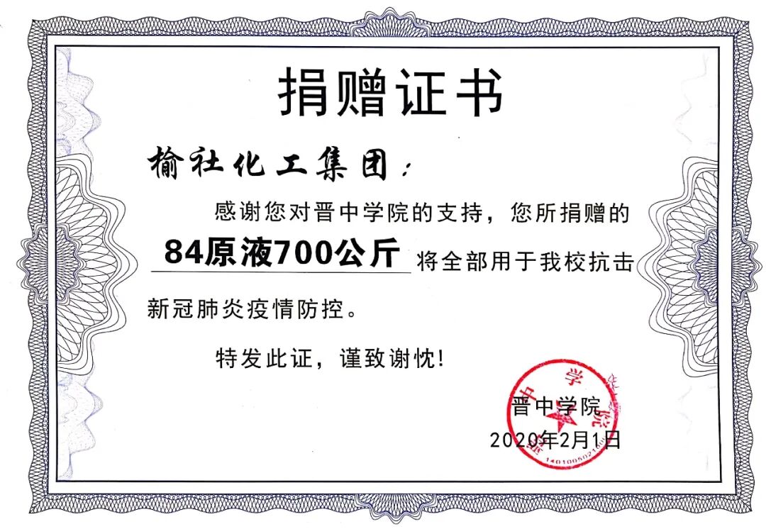 公司在疫情期間兩次為晉中學(xué)院捐贈(zèng)次氯酸鈉消毒液